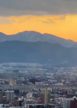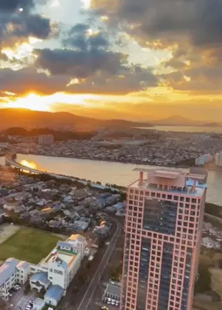 昼は博多湾と市街地が織りなす清々しい景色、夕方は博多湾に沈む夕陽が生み出す幻想的な光景、夜は市街地がキラキラと輝く夜景をパノラマで楽しめる。