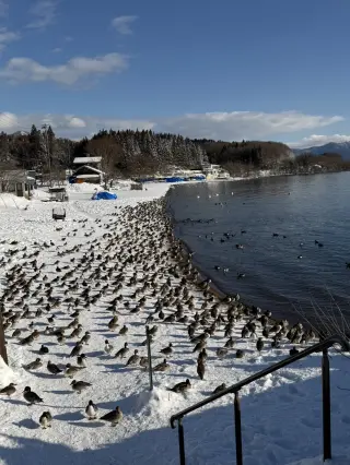 冬になると、「猪苗代湖」にはシベリアから3000羽ほどの白鳥がやって来る。