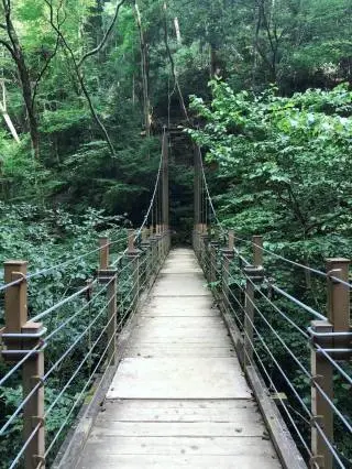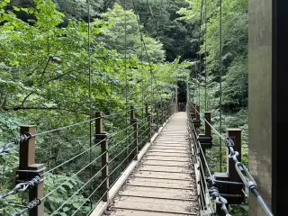 高尾山で唯一の吊り橋があるコースで、記念撮影のために利用する登山者も多い。
