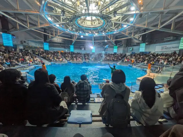 360度どこからでも楽しめる円形会場「ザ スタジアム」では、美しいドルフィンパフォーマンスが行われる。