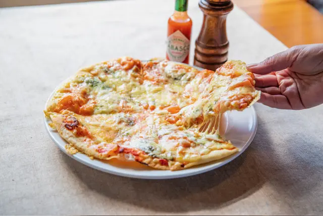 食事はオーナーこだわりのイタリアンが楽しめ、おすすめのメニューは手作りミラノ風ピザ。サクサク食感の生地が特徴のミラノ風ピザは、約10種類が用意されている。なかでも人気なのが、新鮮な生トマトを乗せて焼いた「マルゲリータ(バジルとトマト)」や、野菜がたっぷり乗った「生ハムのサラダ風ピザ」など。