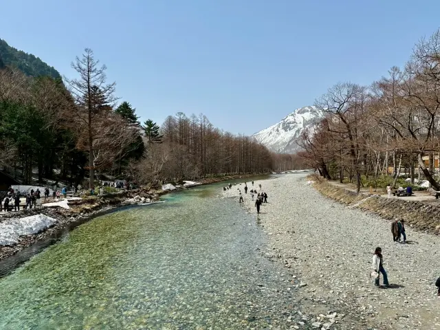 站在桥上可以眺望穗高连峰,以及穗高连峰间的岳泽溪谷等壮丽的风景。桥下是清澈见底的梓川河,河边种满了化妆柳和落叶松,丰富多彩的大自然景观令游客流连忘返。