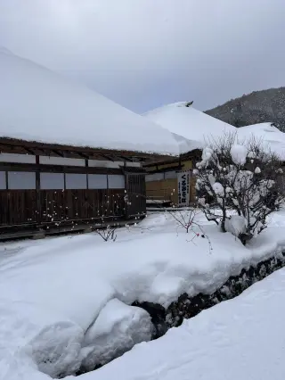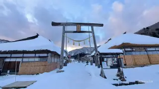 冬季時茅葺建築古民家周遭是一片白雪覆蓋的銀白世界。