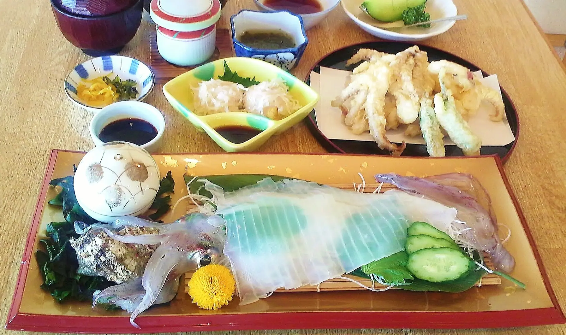 眾多海鮮當中特別要推薦的,就是角島特牛漁港捕撈的最高等級劍尖槍魷「特牛槍魷」。在浮游生物豐富的海域中孕育的特牛槍魷,口感Q彈,帶有濃郁的甜味。「生槍魷御膳」裡,除了有整尾劍尖槍魷的生魚片之外,觸鬚可以選擇做成天婦羅或鹽燒。從水缸裡現撈現切,鮮度絕倫。